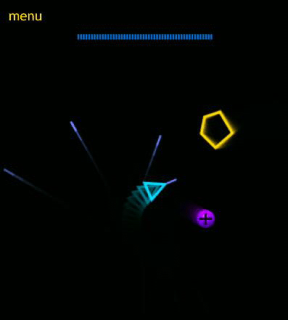 青い三角の宇宙船を動かし、周囲から現れるさまざまな色・形の小惑星を破壊します。上の青いバーは自身の体力ゲージ。画面の上下・左右はつながっています。