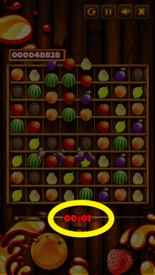 縦横に隣り合う果物をタップで入れ替え、同じ果物を縦横一直線に3つ以上並べて消していきます。
